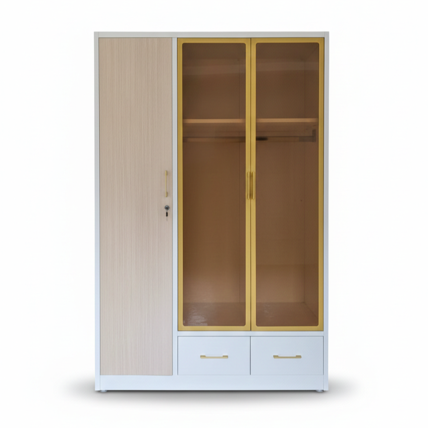 A two-swing door wardrobe, shelves, and hanging rack. two bottom drawers and a safety deposit box. lock and key.