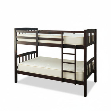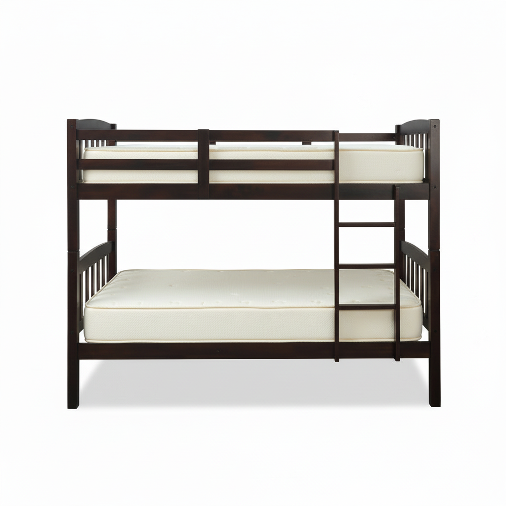 A double deck in wooden frame with slated design headboard and footboard, with ladder.
