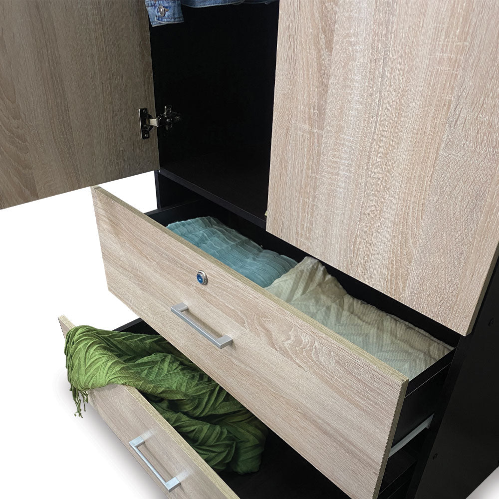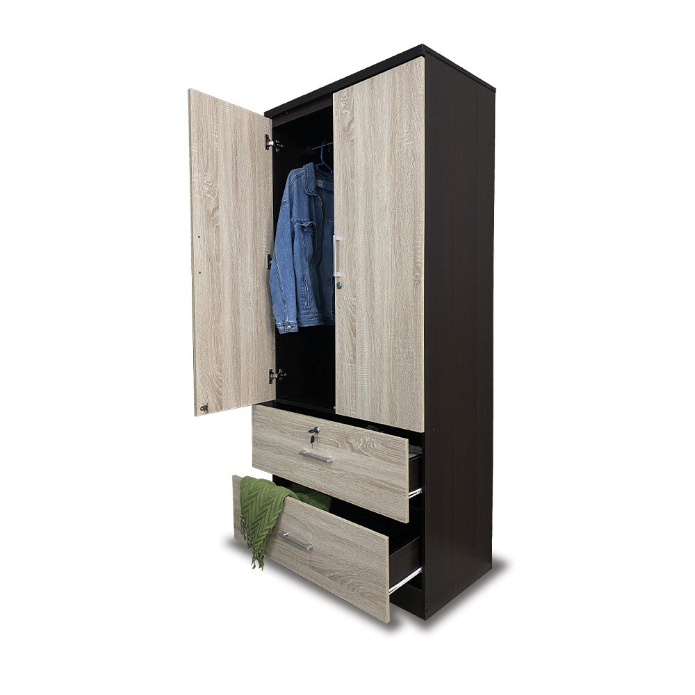 2 door wardrobe with hanger rack & 2 bottom drawers. With lock & key.