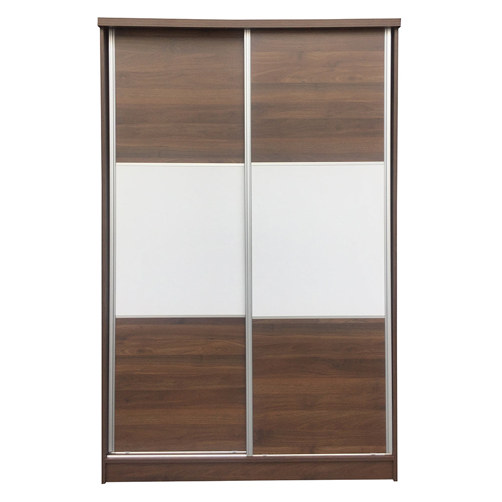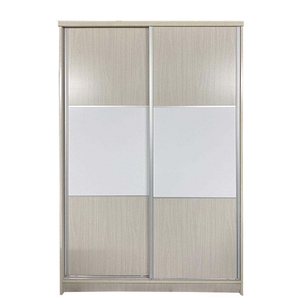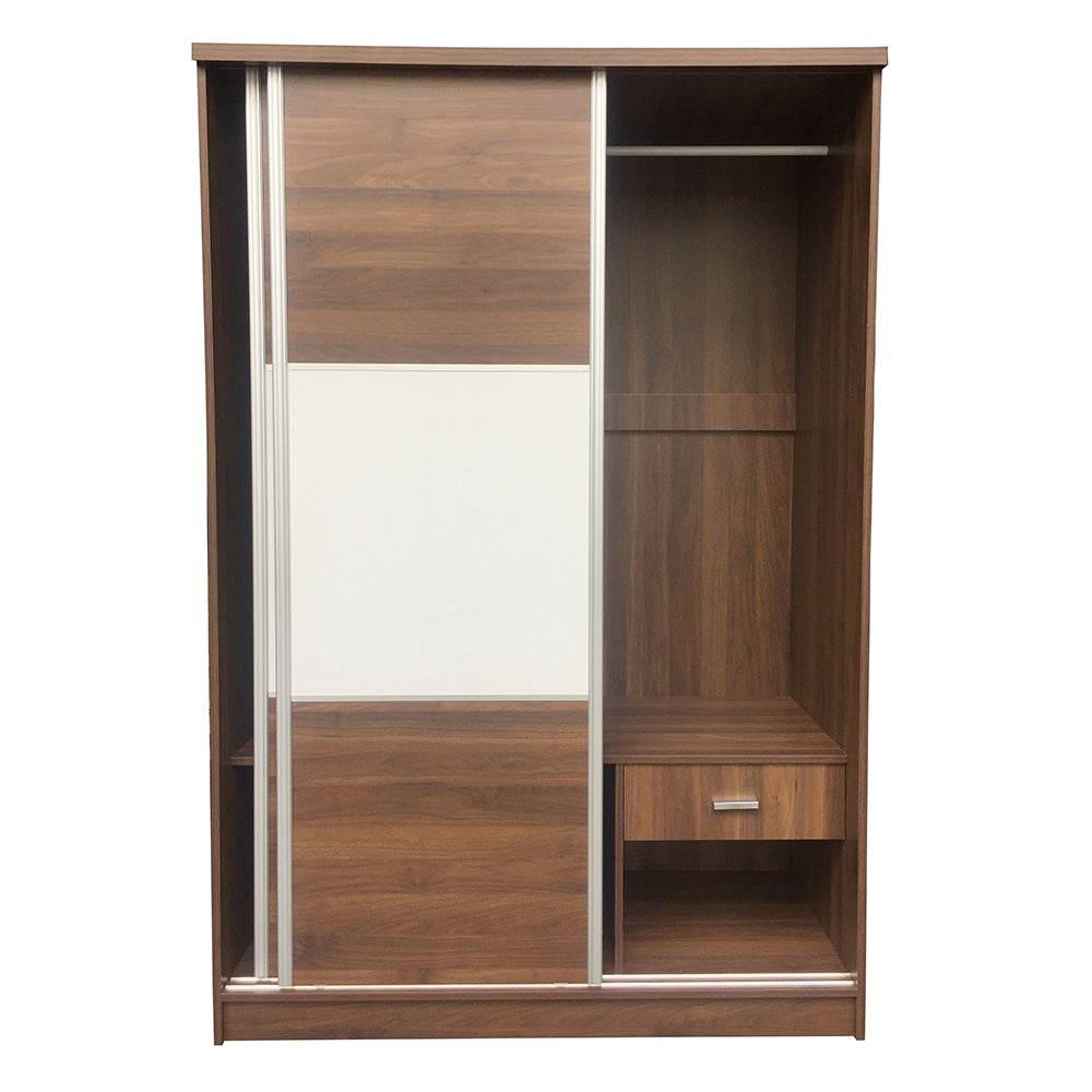 2 Door sliding wardrobe cabinet, 2 tone design hanger rod, open shelves and 1 drawer.
