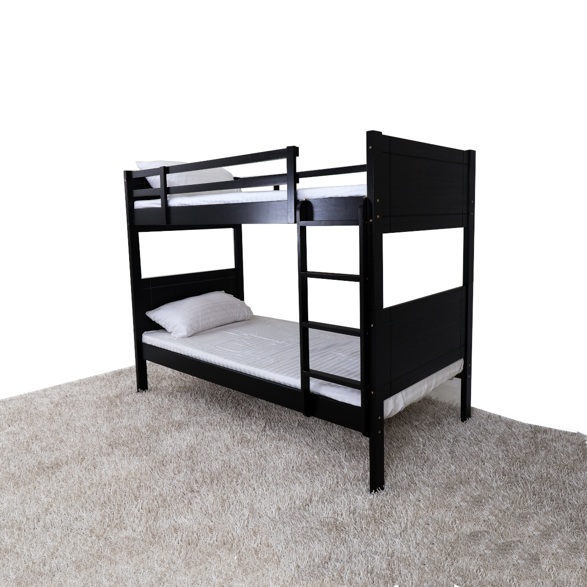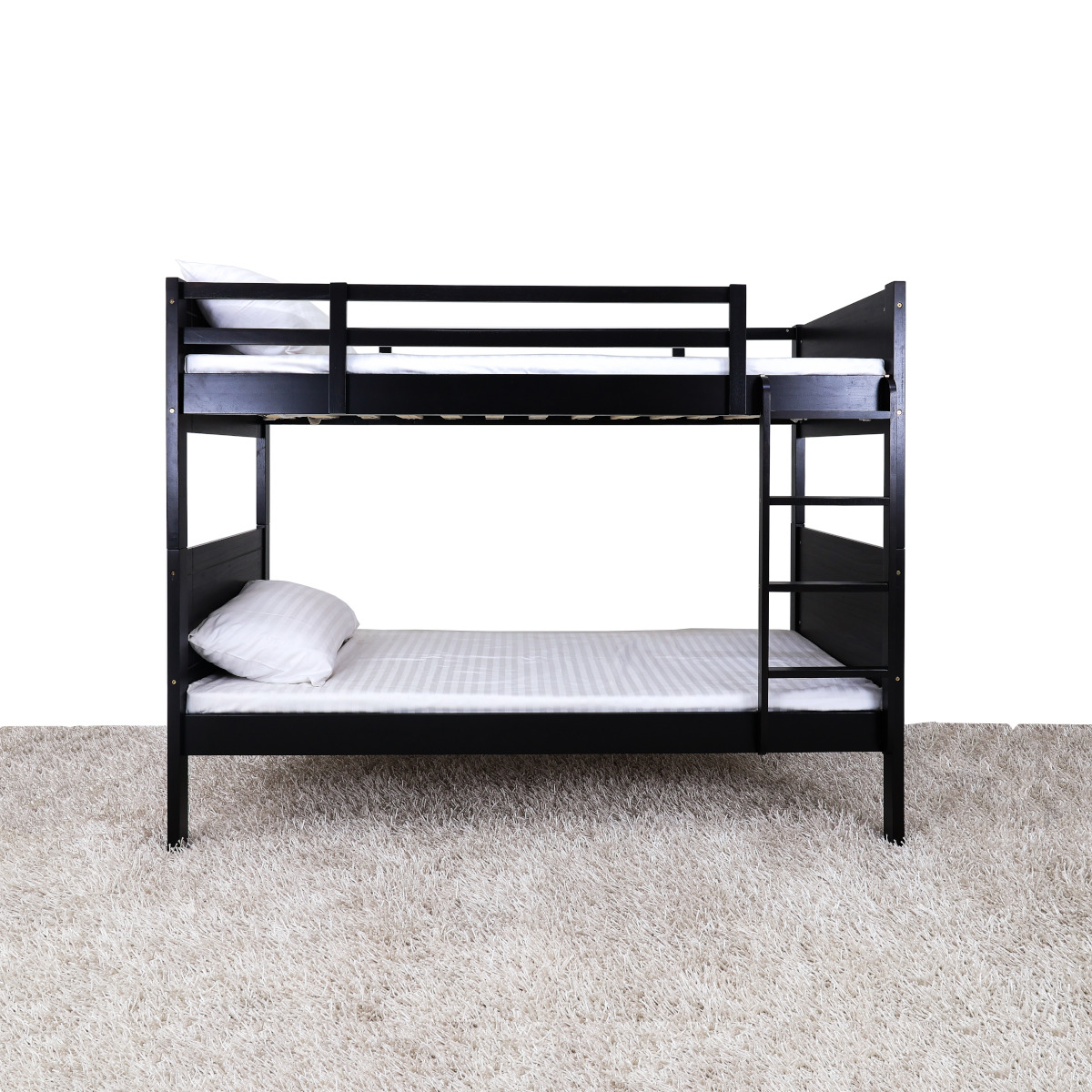 A Double deck in wooden frame with Curved design headboard and footboard. With ladder