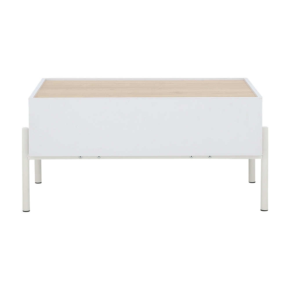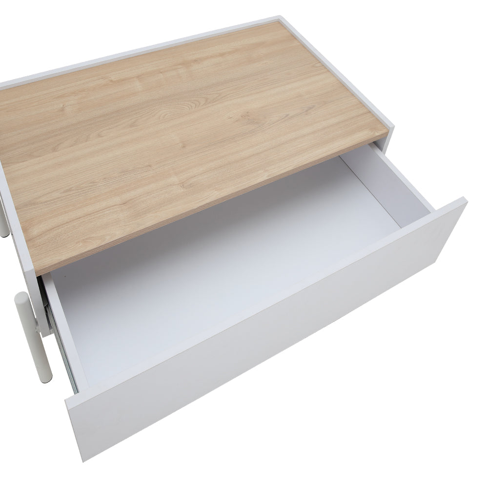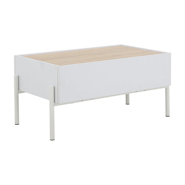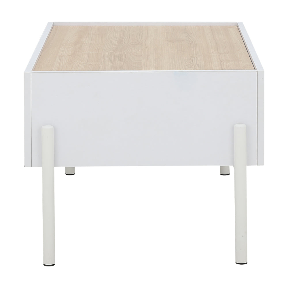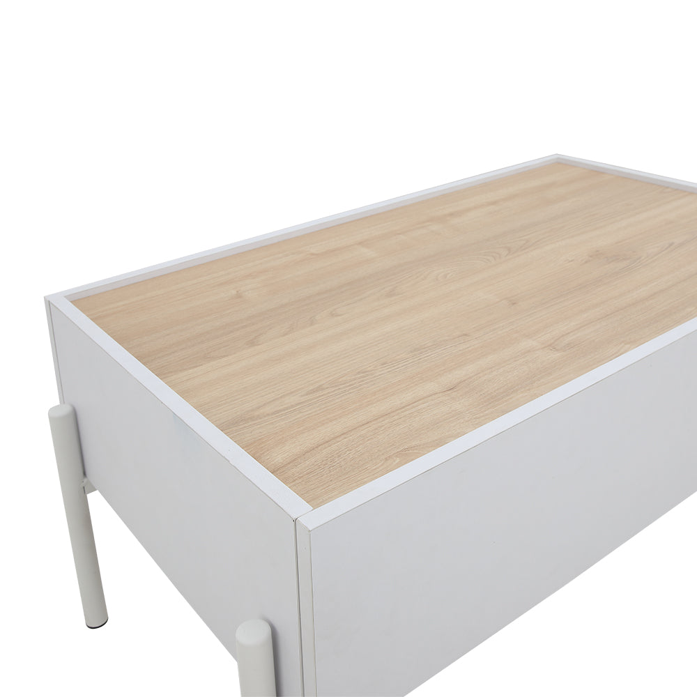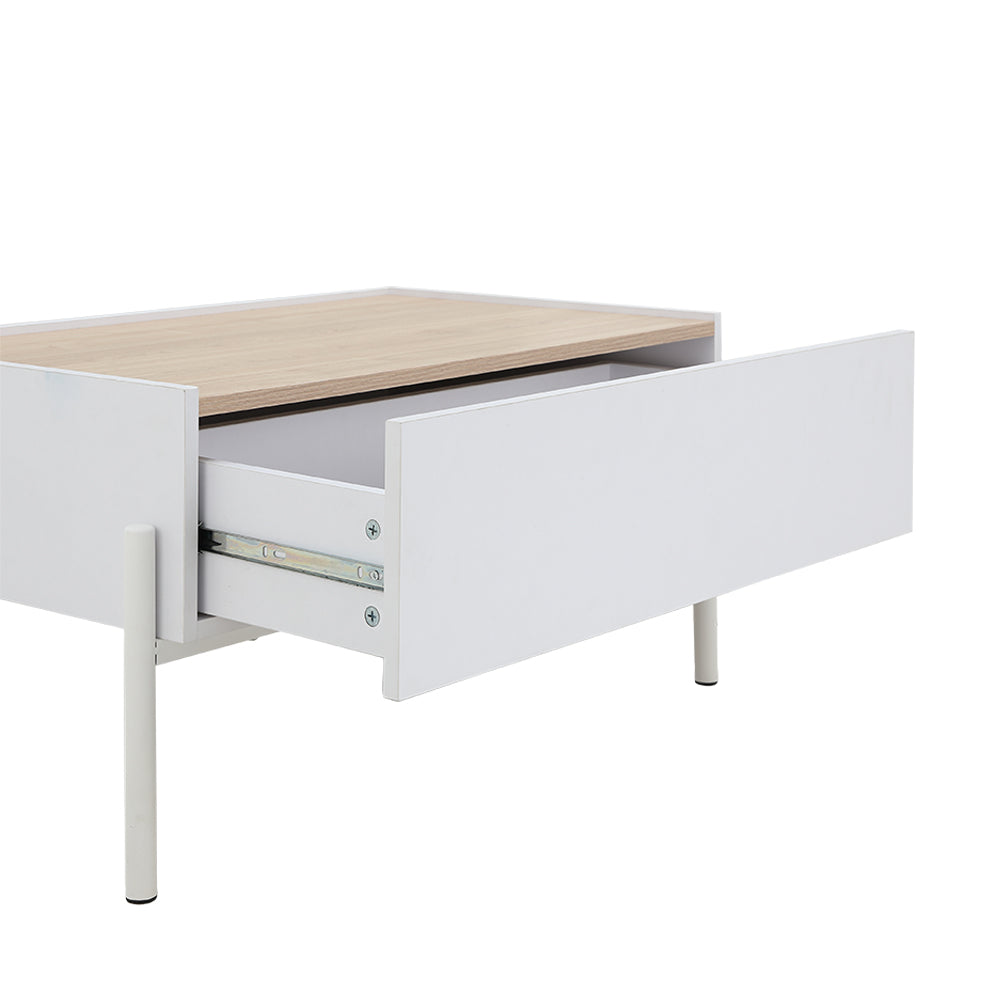 Minimalist rectangular storage center table with light wood grain top on painted steel legs. 1 full extension drawer. Melamine lamination on PB.