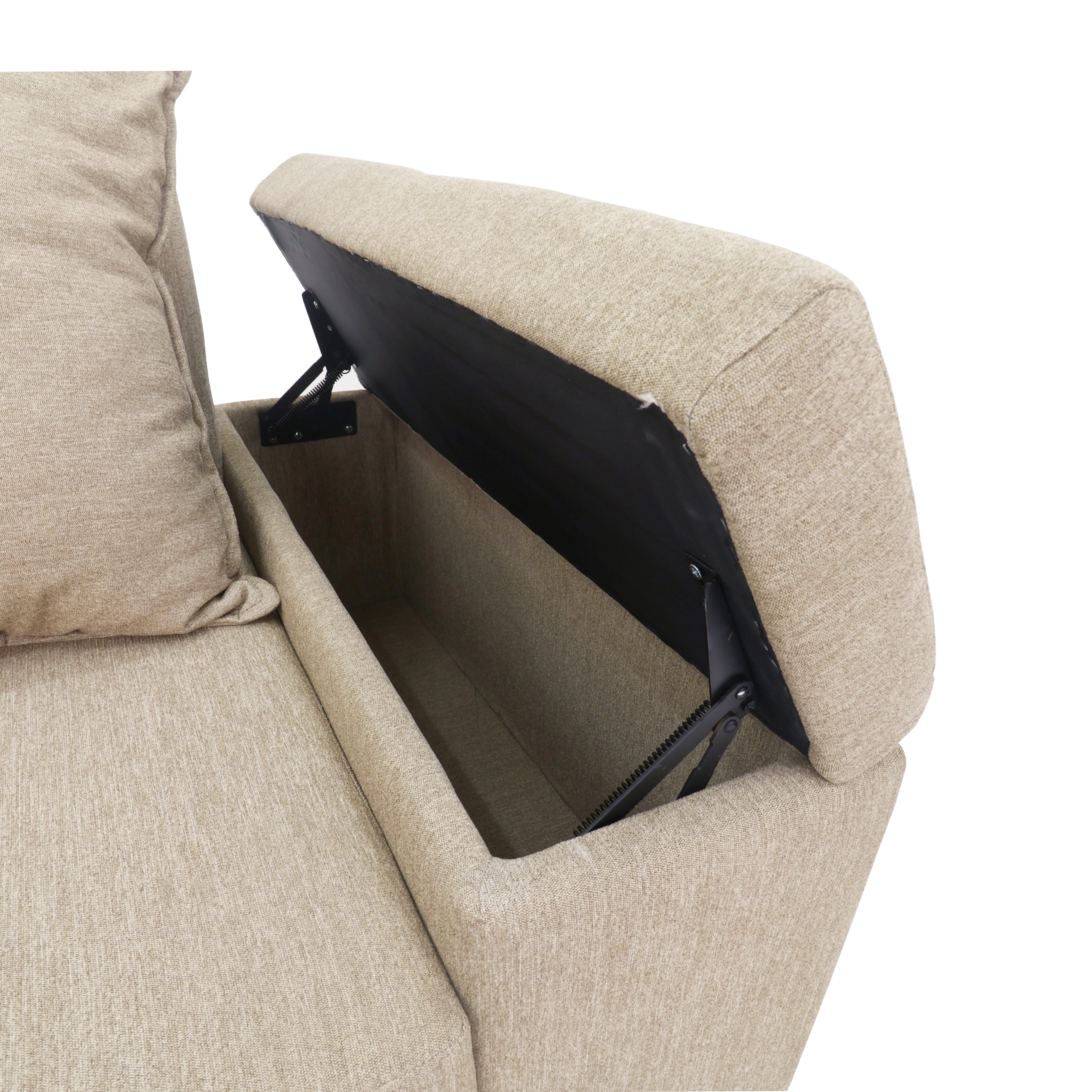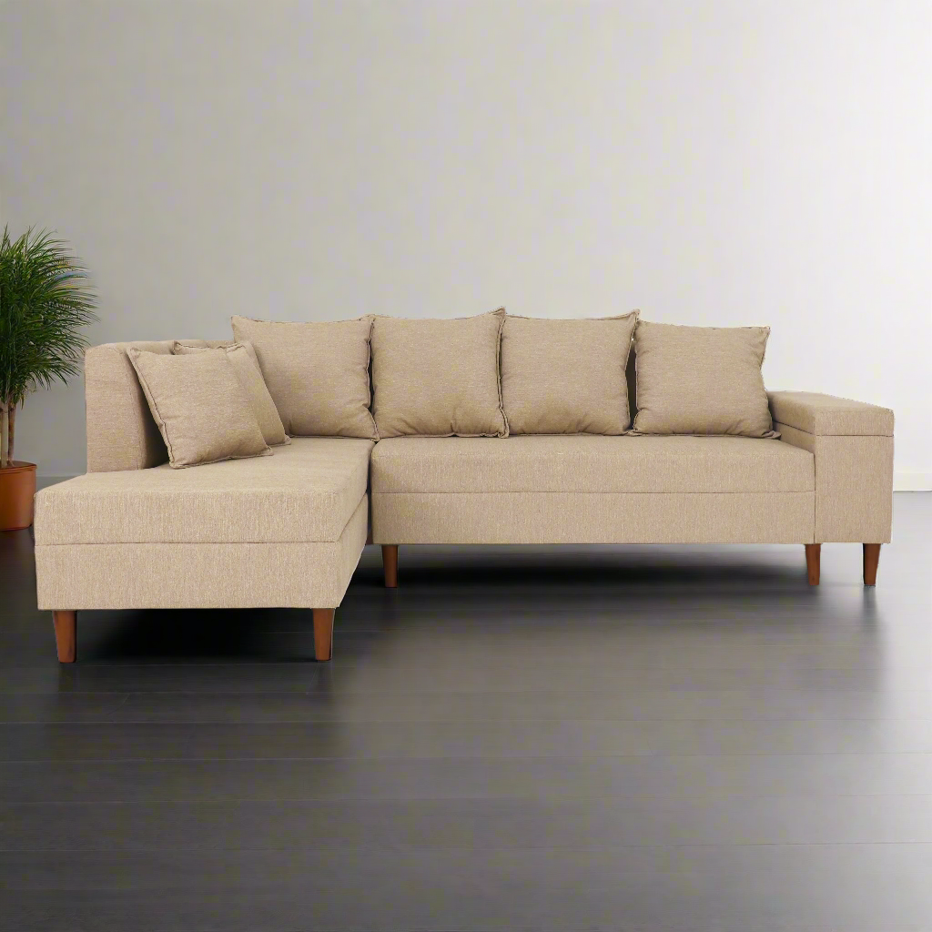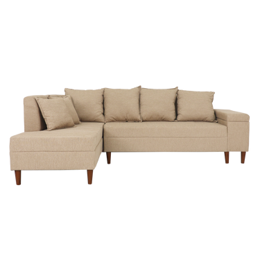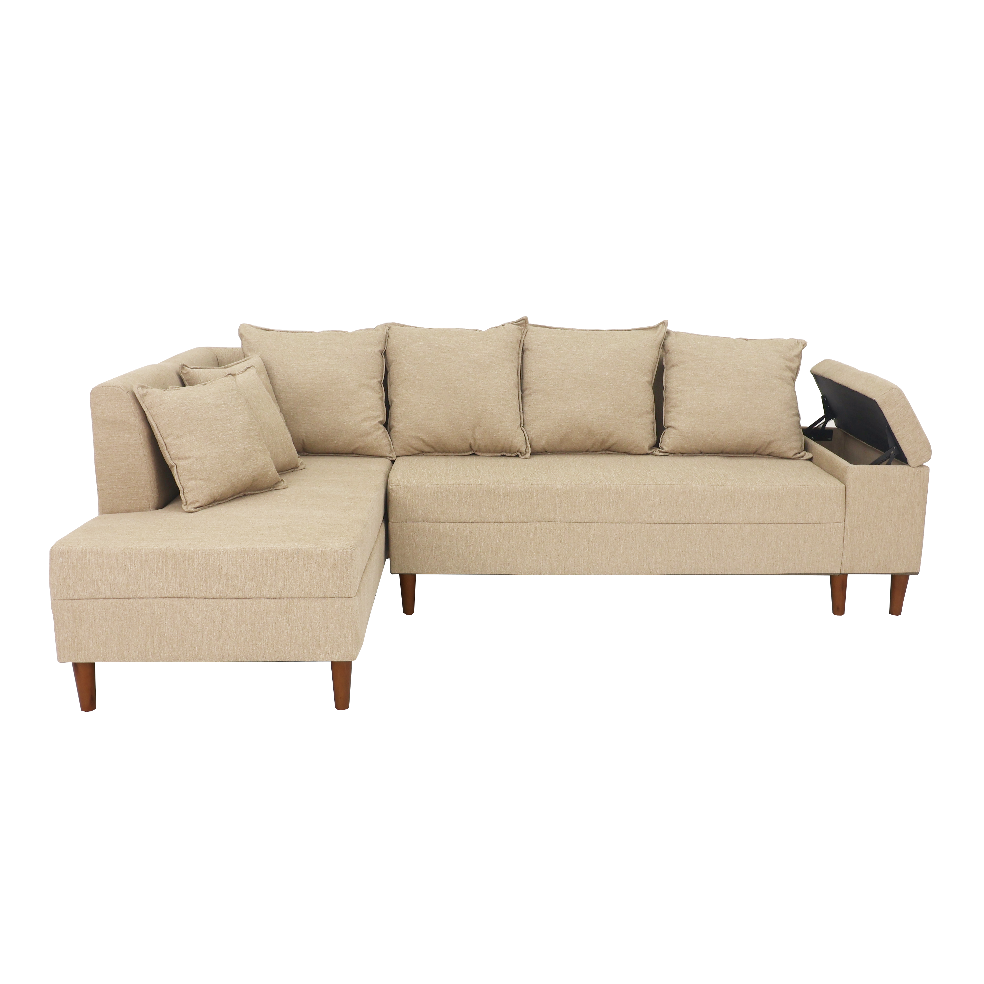 L-shape sofa with 4 pieces backpillow and 3 pieces throwpillows in fabric. Armrest with storage box and tapered wooden legs. Left side chaise.