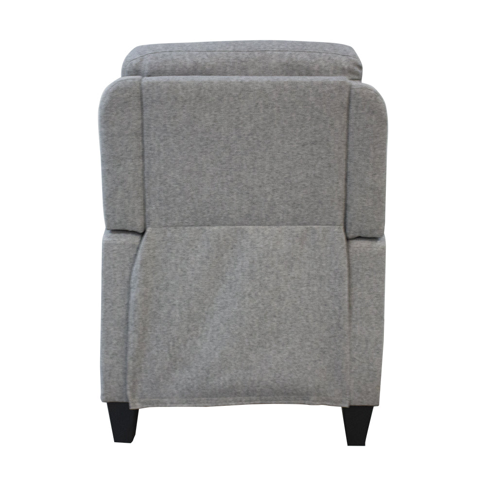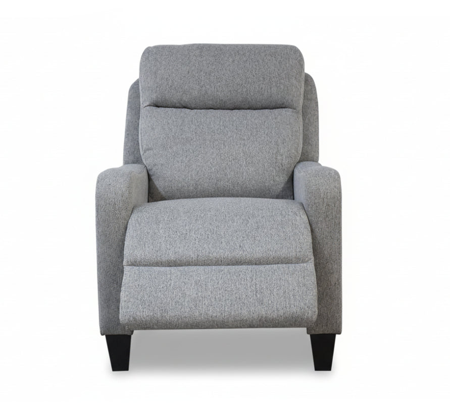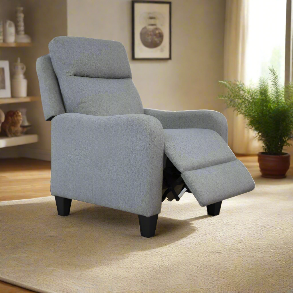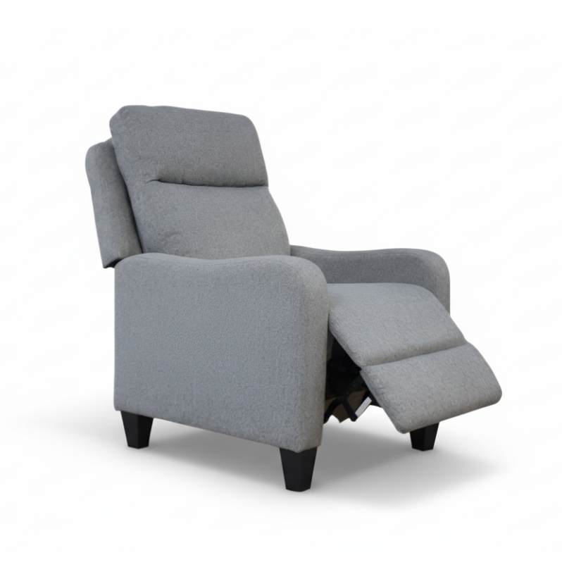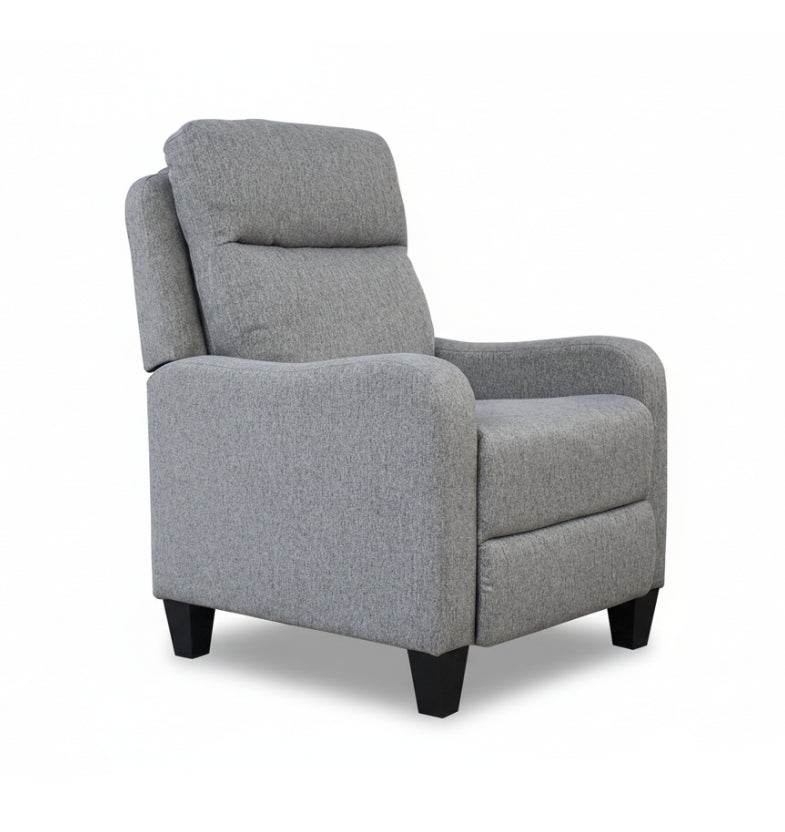 Slim fabric, push-back recliner. Max load 250lbs.