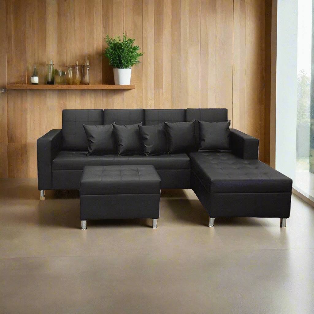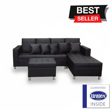 Leatherette sectional sofa with tufted seat and back design. Includes (1) ottoman and (4) small pillows. Right side chaise. Uratex foam inside.