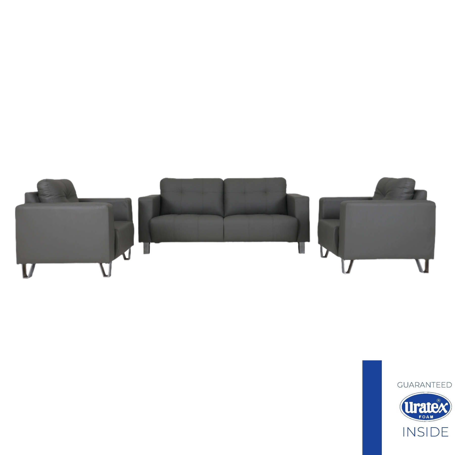 3-1-1 Leatherette sofa set. Timeless track arm sofa with dimple design fixed cushions on stainless angle footings. Uratex Foam inside.
