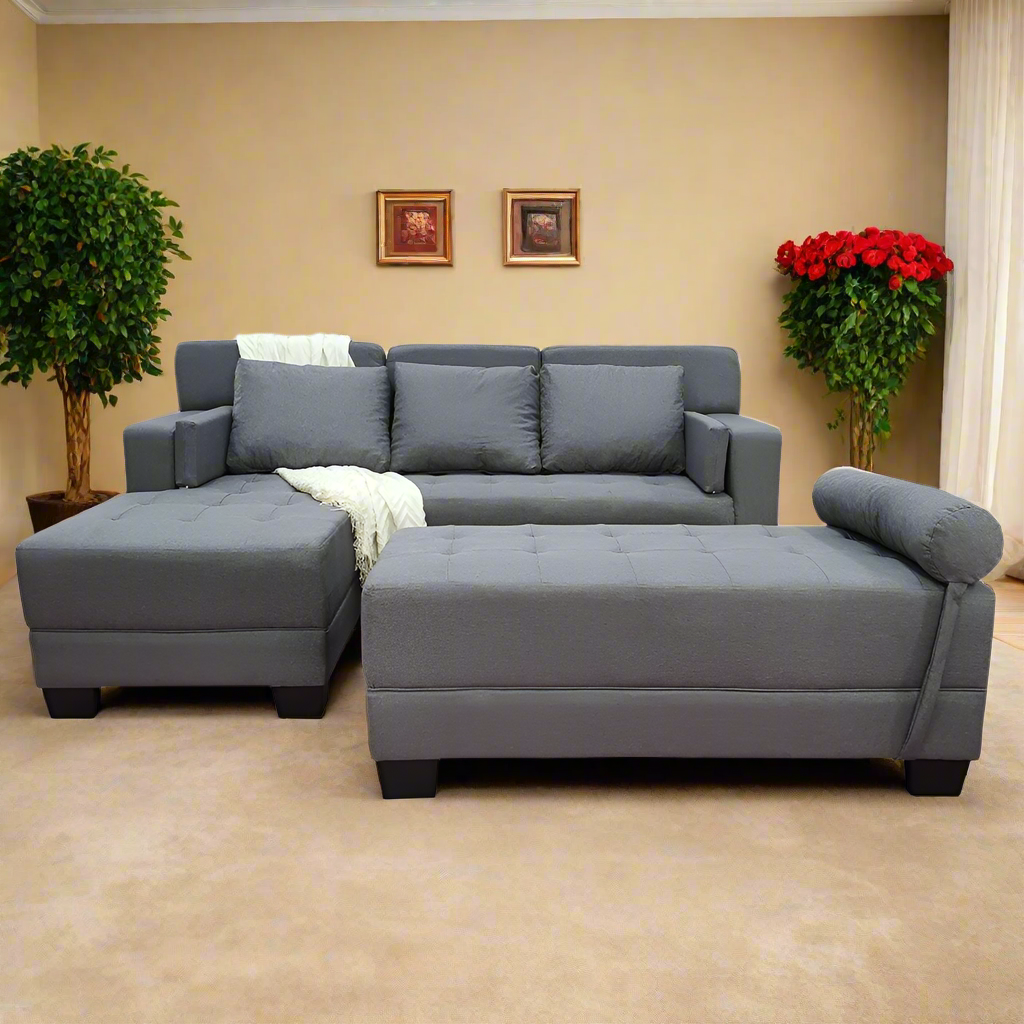 Sectional fabric sofa with (3) back pillows and (2) loose armrest pillows. Includes (1) bench with bolster pillow that can be combined with the sofa to make a comfortable resting space. Left side chaise.