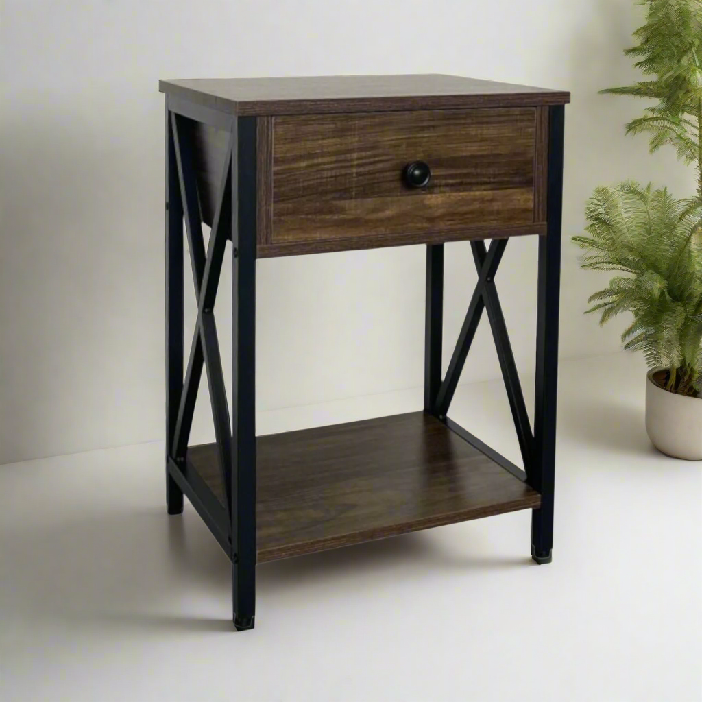 A side table with drawer and shelf on square tube metal legs.