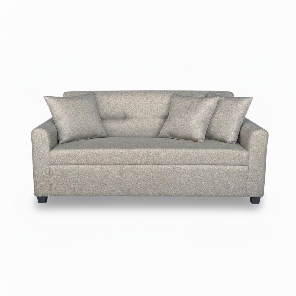 A three seater fabric sofa on plastic legs with three pieces of throwpillows.