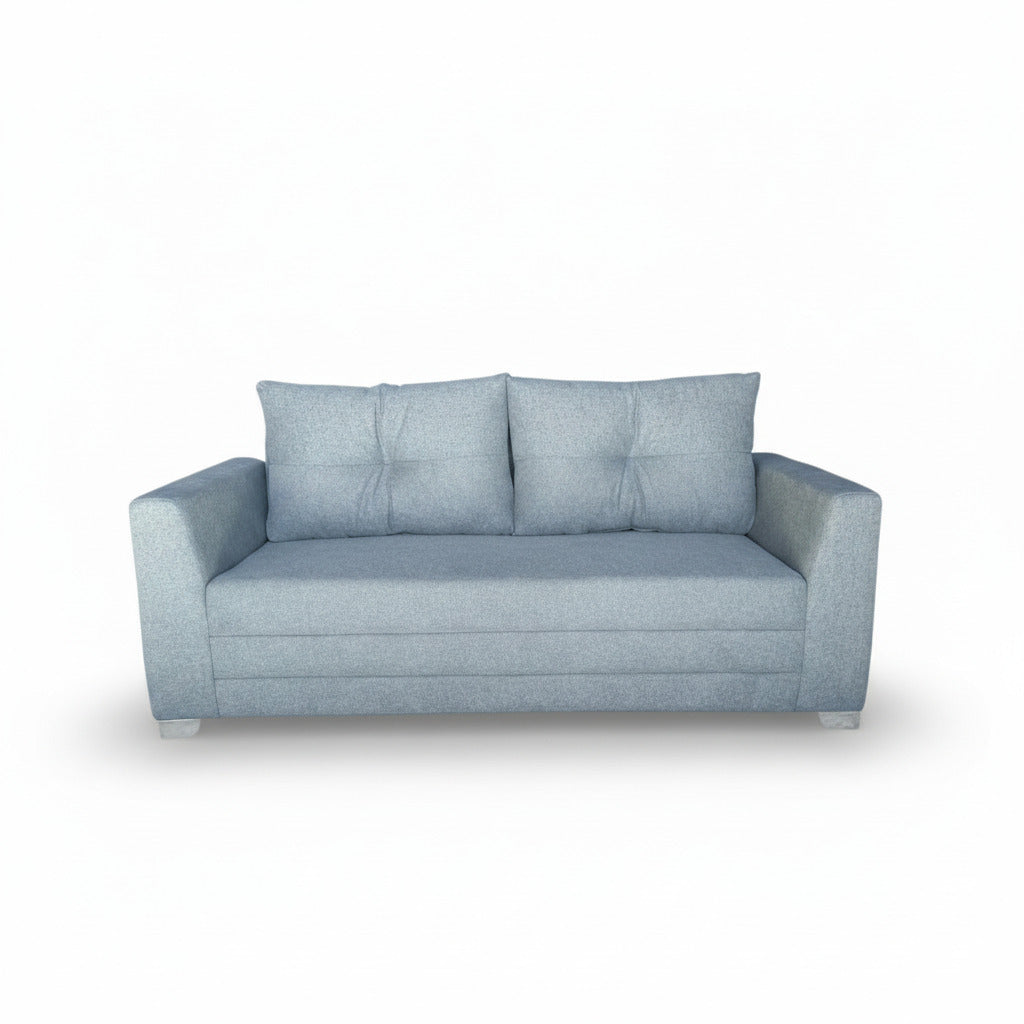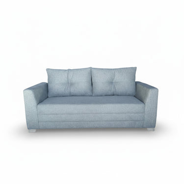 A three seater fabric sofa with dimple designed fixed back pillow on steel legs